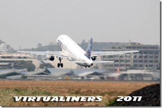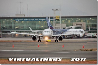 LAN Ecuador, Airbus A320, HC-CLA (EX CC-BAA) despegando por pista 21, como pueden ver aquí también los tiempos de permanencia en el aeropuerto son muy cortos, no mas de 45 minutos: